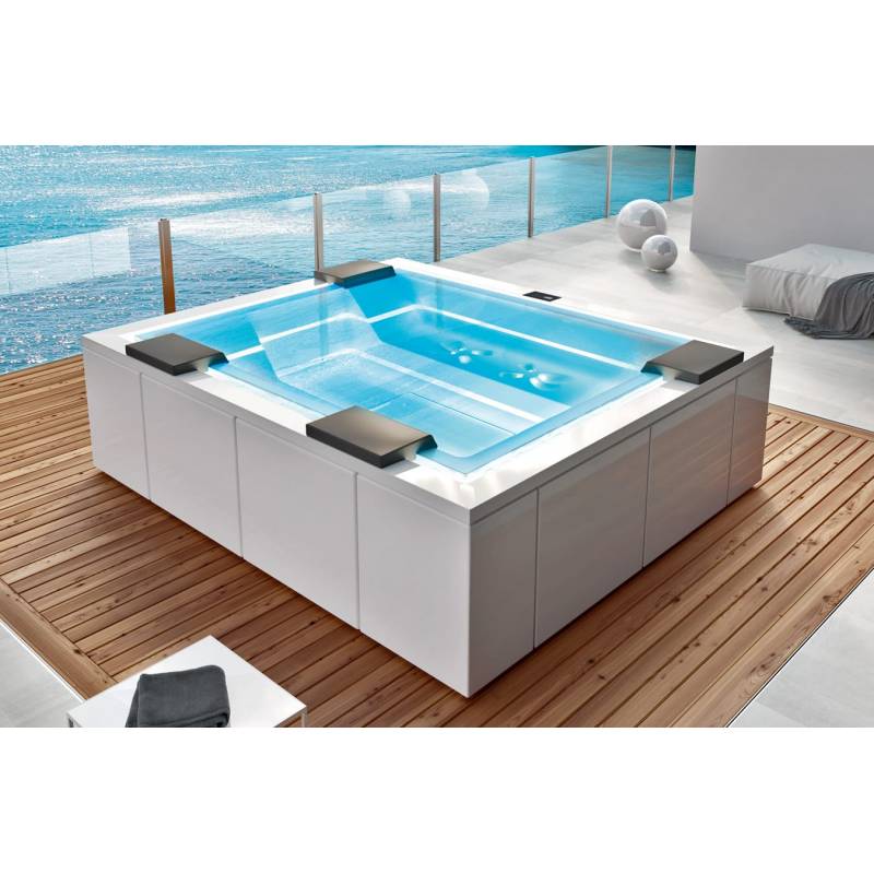 Размеры: 280 x 235 x h85 см. Объем: 2 500 л. Вес: 450 кг. Количество мест: 6 Лежачее место: Есть. Информация о товаре: чаша бассейна из материала Crystaltech© металлический каркас 24 верхних гидромассажных форсунки Ghost System 16 нижних гидромассажных форсунок Ghost System (опция для SPA) 24 аэромассажных форсунки (опция для SPA) два гидромассажных насоса пульт управления бассейном с ЖК дисплеем электронагреватель 3 кВт с регулятором температуры система фильтрации с песочным фильтром автоматическое налив бассейна датчик уровня автоматический слив бассейна хромотерапия по периметру из одиночных светодиодов для нижнего гидромассажа (опция) система озонирования воды хромотерапия по периметру из одиночных светодиодов для переливного борта (опция для SPA) хромотерапия по периметру из одиночных светодиодов для верхнего гидромассажа (опция) боковые панели (опция) теплоизолирующая крышка-чехол (опция)
